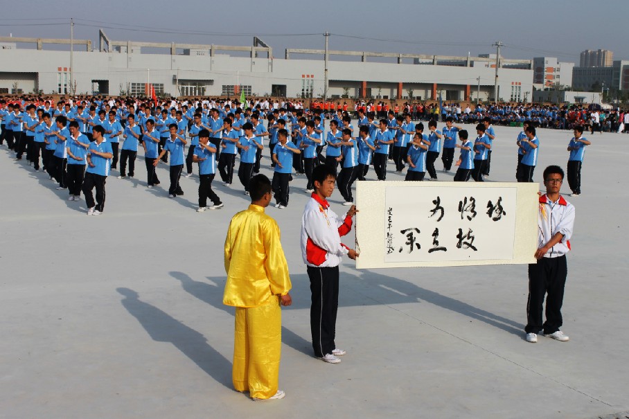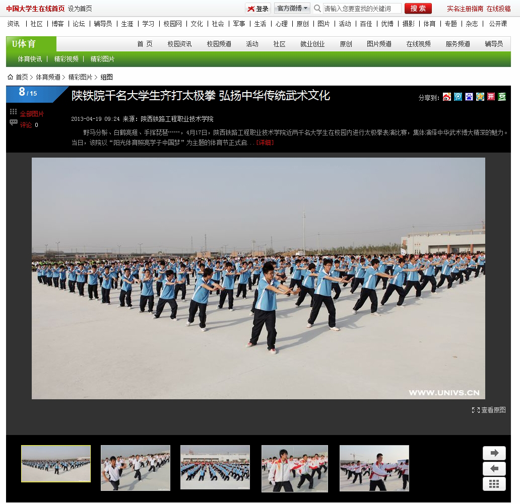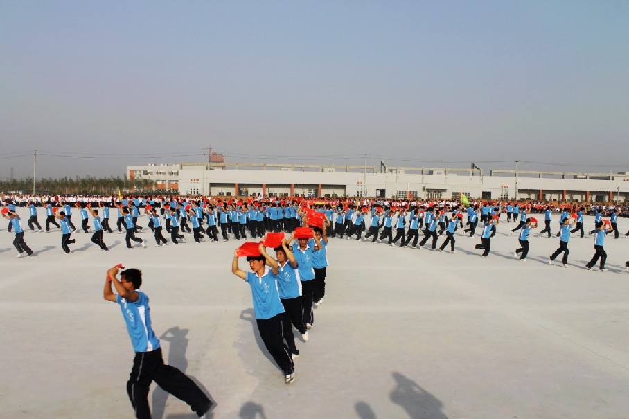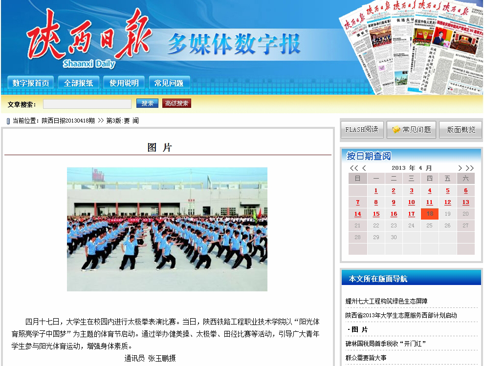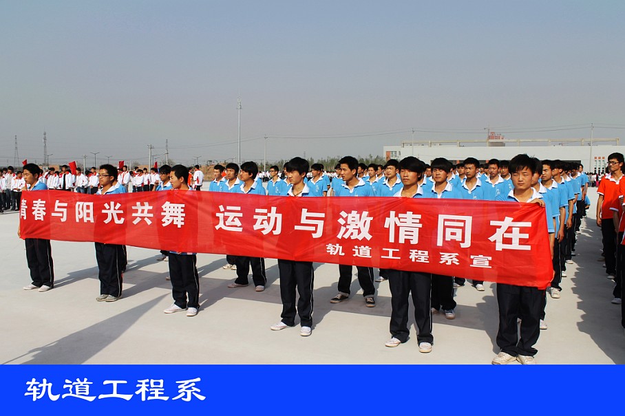 4月17日下午,陕铁院第九届田径运动会开幕式在高新校区田径场举行,轨道工程系参加团体操表演的200名同学在一个多月的筹备训练中同学们流下了辛勤的汗水,大家辛苦了!记住我们的口号:“我运动 我健康 我参与 我快乐”!今天出版的《陕西日报》要闻版(第3版)报道公司第九届体育节活动开幕式,西部网与中国老员工在线相继进行了报道,图为:轨道工程系太极方阵,敬请点击浏览。