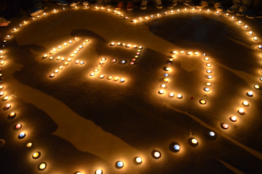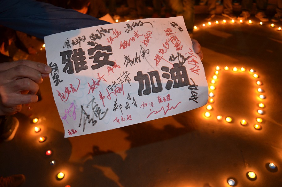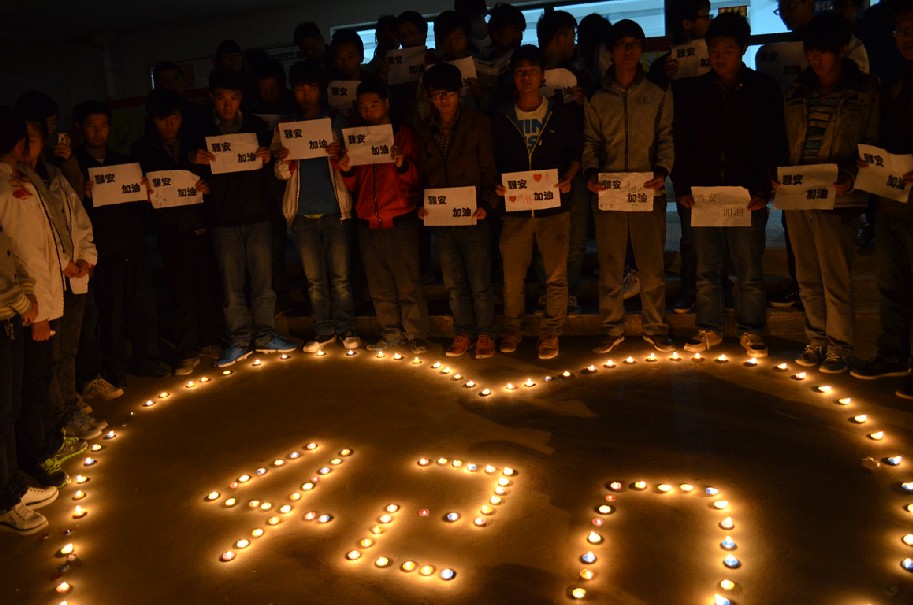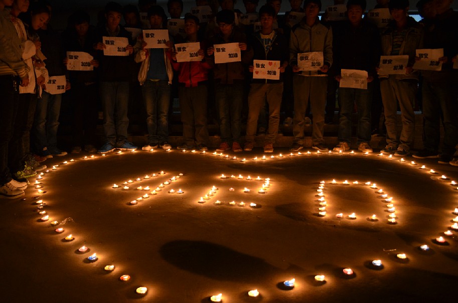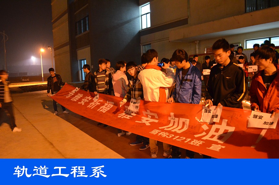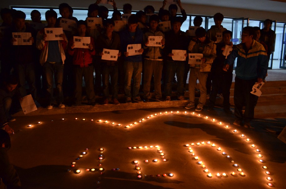 4月22日21:30分,轨道工程系盾构3121班同学在公寓楼前用写祝福、叠纸鹤、点蜡烛,为雅安祈福平安!