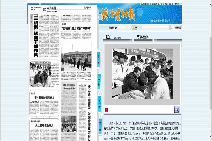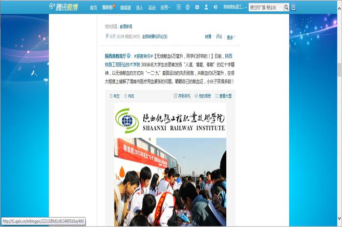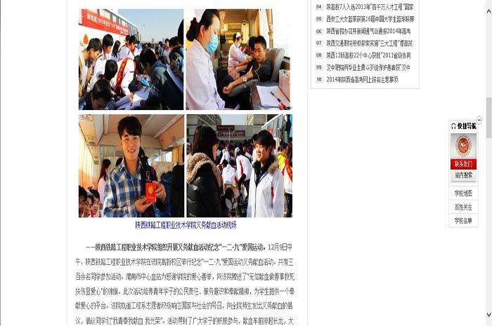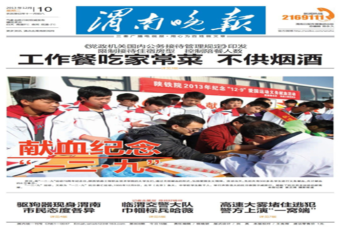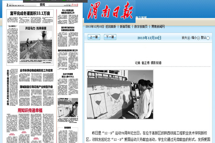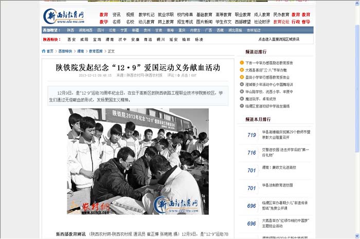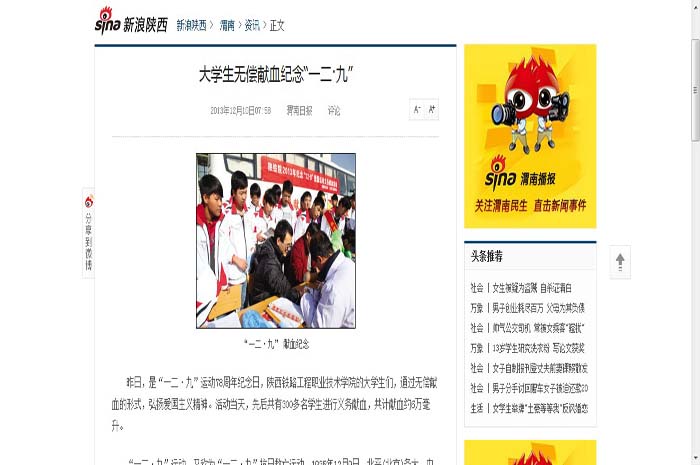 12月9日中午,陕铁院积极开展2013纪念“12•9”爱国运动义务献血活动,此次活动是由院团委主办轨道工程系承办,轨道工程系共有三百余名同学参加活动。此次活动得到了陕西省多家媒体报道。