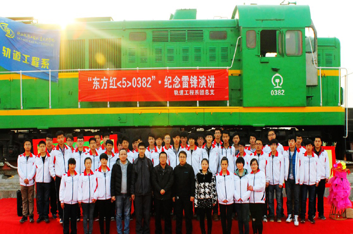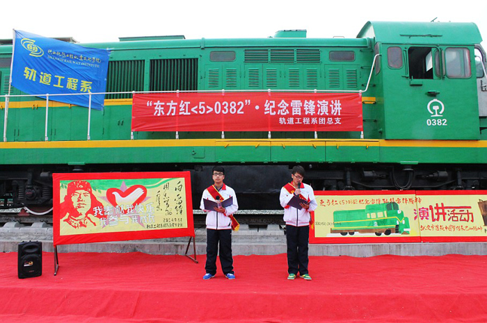 3月4日下午,轨道工程系团总支在高新校区标志性景观东方红机车前,开展“东方红<5>•0382纪念雷锋演讲”活动。出席此次活动的有,员工处副处长姜留涛、公寓管理中心副主任宋勇,轨道工程系系办公室主任贾良及辅导员等。
