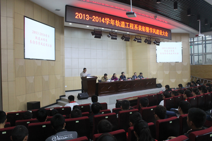 10月22日下午,轨道工程系在高新校区博爱厅召开“2013-2014学年轨道工程系表彰暨学风建设大会”,公司副经理焦胜军,员工处、轨道工程系及各教研室负责人,辅导员、班主任等与500多名员工代表参加了会议。与会领导为该系2013-2014学年获奖员工颁发了荣誉证书。