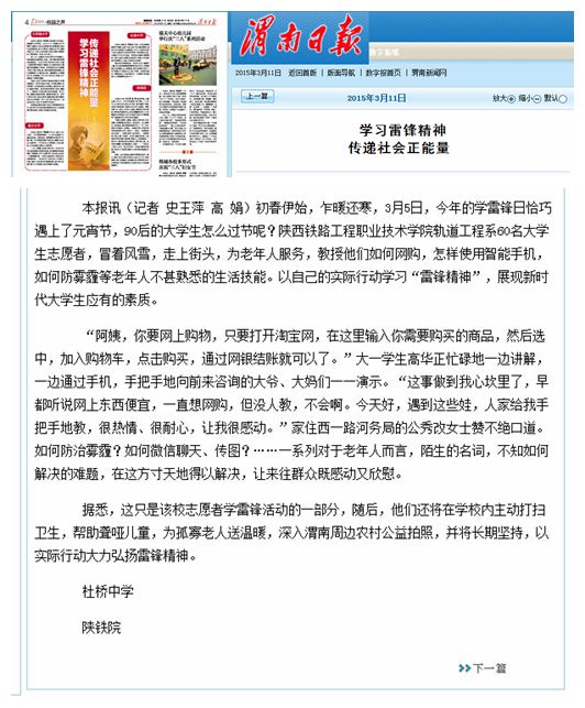 今天出版的渭南日报第08版教育周刊校园之声版块,以《学习雷锋精神 传递社会正能量》的标题报道了bevictor伟德官网轨道工程系3月5日在中心广场开展的“e时代”SXRI学雷锋便民服务活动。