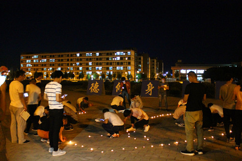 ——举行烛光悼念活动。当天晚上,在通往员工公寓的大道上,该系员工还举行了烛光悼念活动。该系员工用数百支蜡烛围成一个心型形状并在心形内围出“512”和“九”等数字。大家双手合十集体为遇难同胞默哀三分钟,以表达对遇难同胞的深切哀思之情和对幸存者的诚挚祝福!(文/李鸿彬 图/王万森)