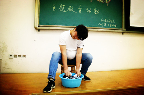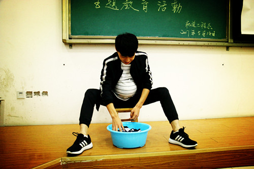 ——一份特殊的体验。自愿者装扮成孕妈从事十分钟的“洗衣服”或“扫地”等家务劳动。自愿者臃肿的身躯,笨拙的动作令在场员工忍俊不禁。体验者刘超波同学体验后深有感触地说:“十分钟就像十个小时那样漫长,而母亲却要经历十月怀胎,其中多少艰难困苦,真是一言难尽啊”!他的感慨引发了现场情感共鸣,大家情不自禁地掏出手机,在主持人的倡议下把“母亲,您辛苦了!我真的爱您!”的感恩短信发送给远方的母亲。(文/李鸿彬 图/王江)