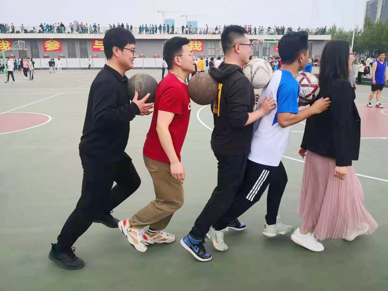 本次趣味运动会分为三个阶段,各个教研室为一组队。第一阶段为“保龄足球”,即用足球撞击矿泉水瓶,每个教研室各出5人,依次进行踢球,总计踢倒的瓶子数;第二个阶段为“筷子夹球接力赛”,即用筷子夹乒乓球接力,计算时长;第三个阶段为“拥抱篮球团体赛”,即5人中间分别夹着篮球来回跑一圈,考验队友的默契度。