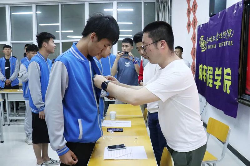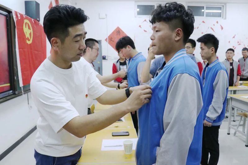 期间,由团总支书记蒋萌做开场词,培训班是深入学习贯彻习近平新时代中国特色社会主义思想,全面贯彻落实团的十八大精神,深入实施青年马克思主义者培养工程,培养共青团员的理想信念、政治认同、家国情怀、道德品行和责任担当。团课培训班班主任韩俨向同学们宣读培训班纪律要求。之后,在奋进的团歌中,蒋萌、韩俨为八名新团员们佩戴团徽,并由韩俨老师带领新老团员紧握右拳,面对团旗进行庄严宣誓。