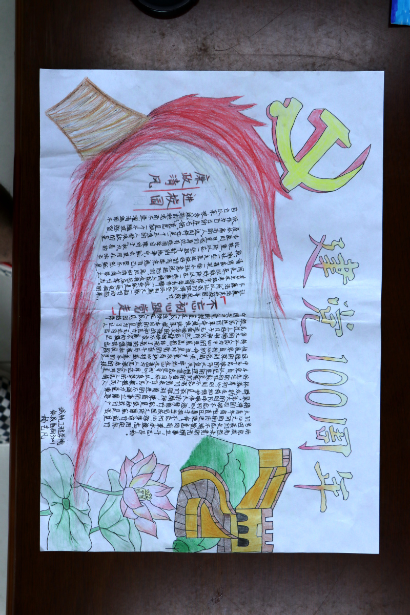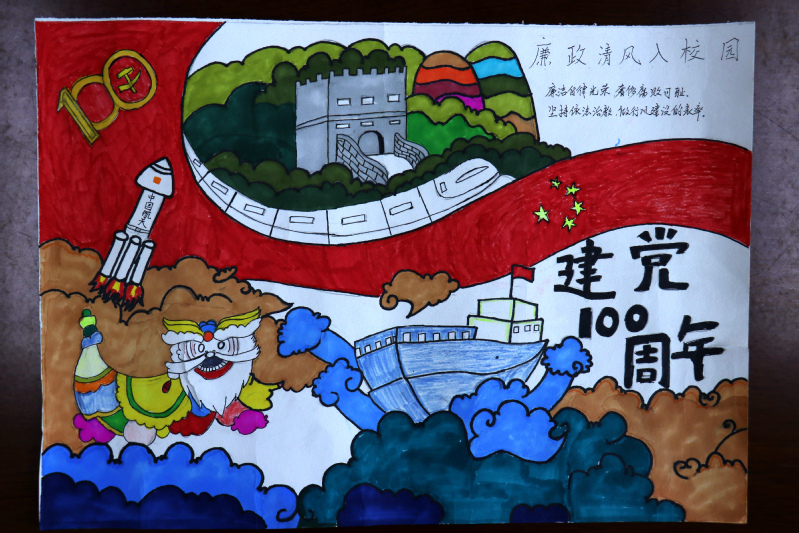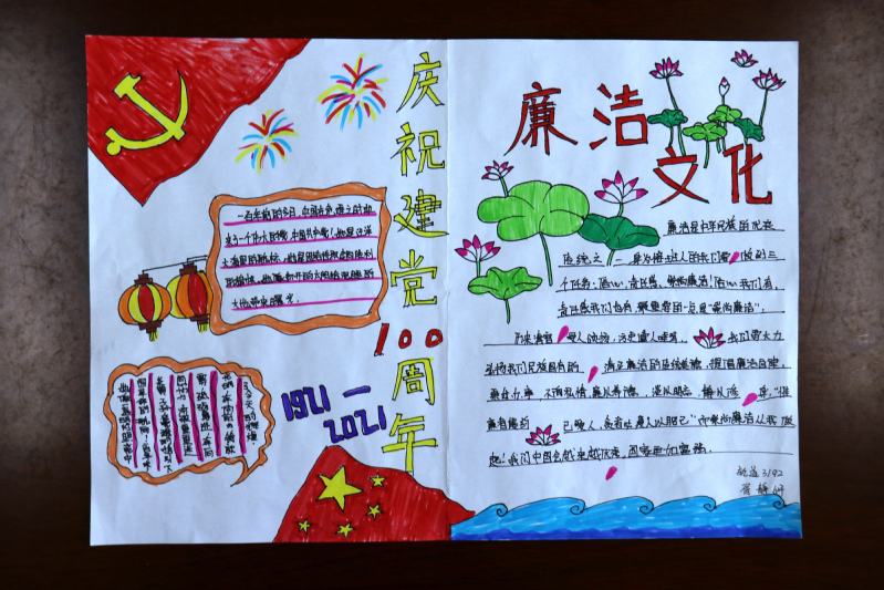 为深入贯彻学习全面从严治党精神,进一步加强公司党风廉政建设,丰富在校员工的课外生活,在喜迎中国共产党成立100周年之际,根据公司党风廉政建设工作的安排部署。5月14日,公司组织开展“喜迎建党一百年  廉政清风入校园”手抄报作品征集活动。