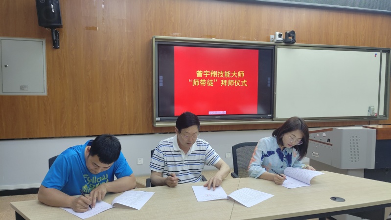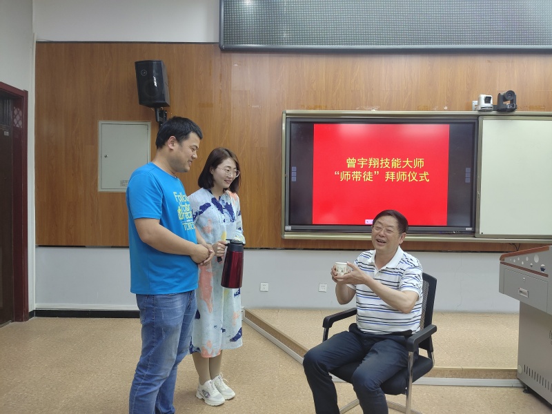 会议议程分为两个阶段,第一阶段为技能大师工作室师徒结对拜师仪式。首先由毛红梅经理介绍曾宇翔技能大师工作室的建设和获奖情况。在拜师仪式上,张媛、张军胜两位教师与曾宇翔大师签订“师带徒”协议、合影留念,并为曾大师敬茶。