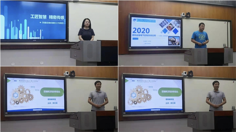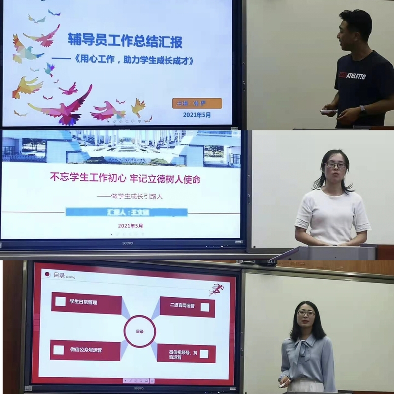 第二阶段由2020年新进教师进行试讲,四名专任教师进行十分钟试讲,并从教学任务完成、课程建设参与等方面,三位辅导员对员工管理工作等方面,分别汇报入职近一年工作总结。汇报结束后,由宋秀清、拜颖乾两位教师代表公司教学督导组,分别从课堂教学组织设计、思政点融入、板书设计、重难点展示、语言表达与语速等方面反馈听课情况。