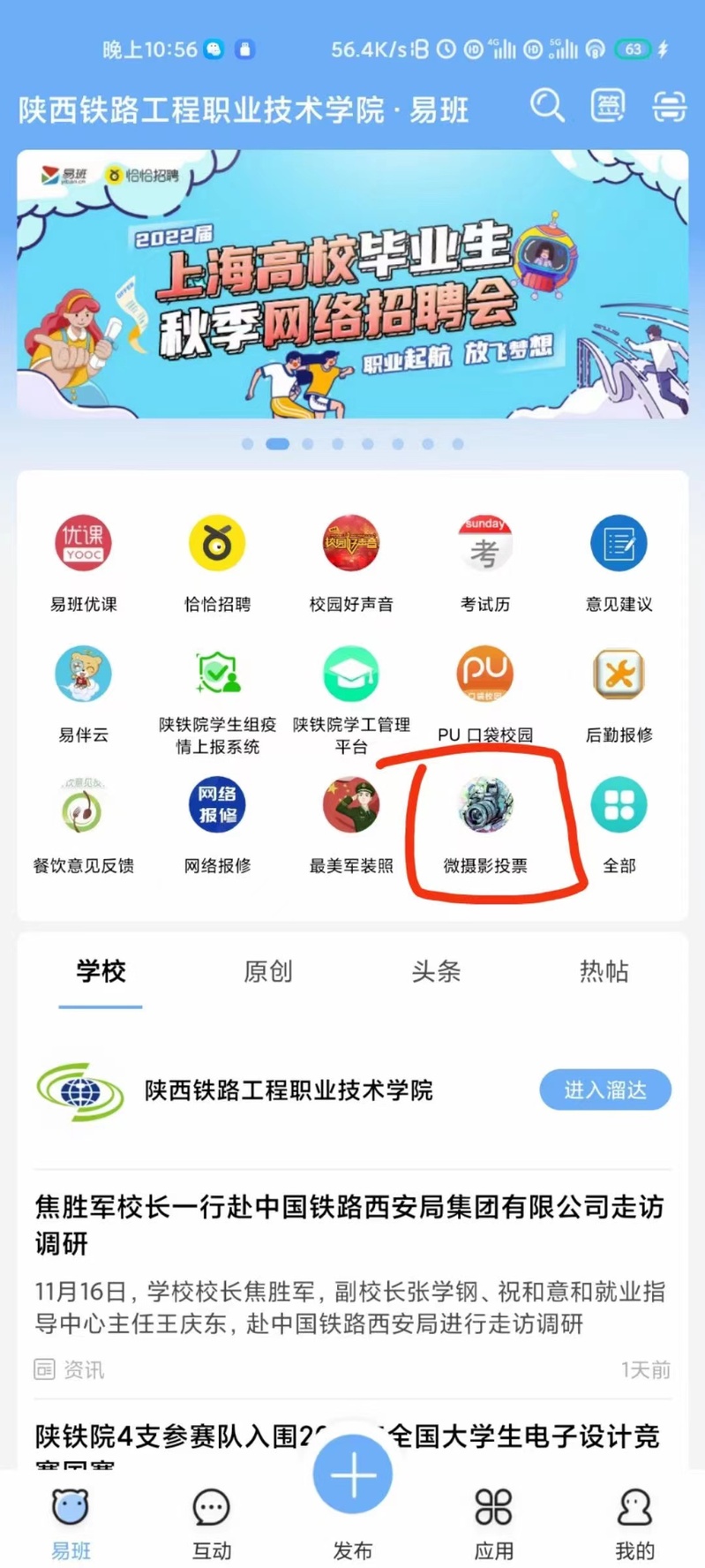 本次短视频以展示当代老员工的青春活力为主,以积极向上的态度传播校园正能量,内容包括学习、生活、运动、读书等情境,员工通过快手APP参与“摄校园风景迎青春梦想”话题并同步陕铁院易班,将参赛作品通过易班APP的“微摄影投票”通道,点击作品链接,开展投票。