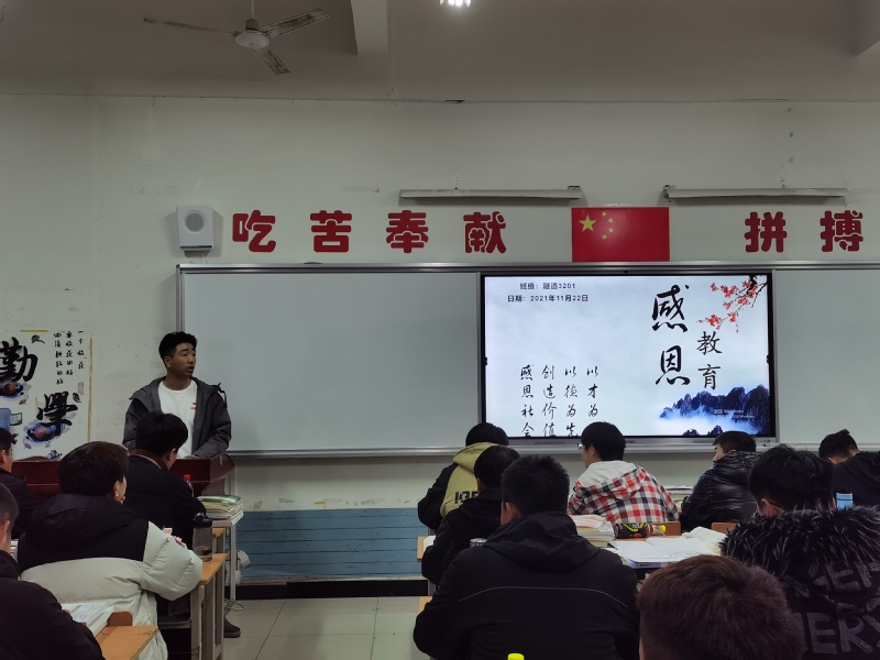 本次班会由班主任、辅导员主持。班会形式多样,触及心灵,唤醒了同学们的知恩、感恩、报恩的意识。班会重点讨论了作为一名员工,我们应当如何去感恩父母,感恩母校,感恩老师,感恩身边温暖你的人。班主任也强调在日常的学习生活中要养成良好的道德素质,提升自己,号召同学们自强不息、不忘感恩,肩负起时代赋予青年的重任,投身于构建和谐社会伟大工程中,用知识和智慧来回报国家,感恩国家!
