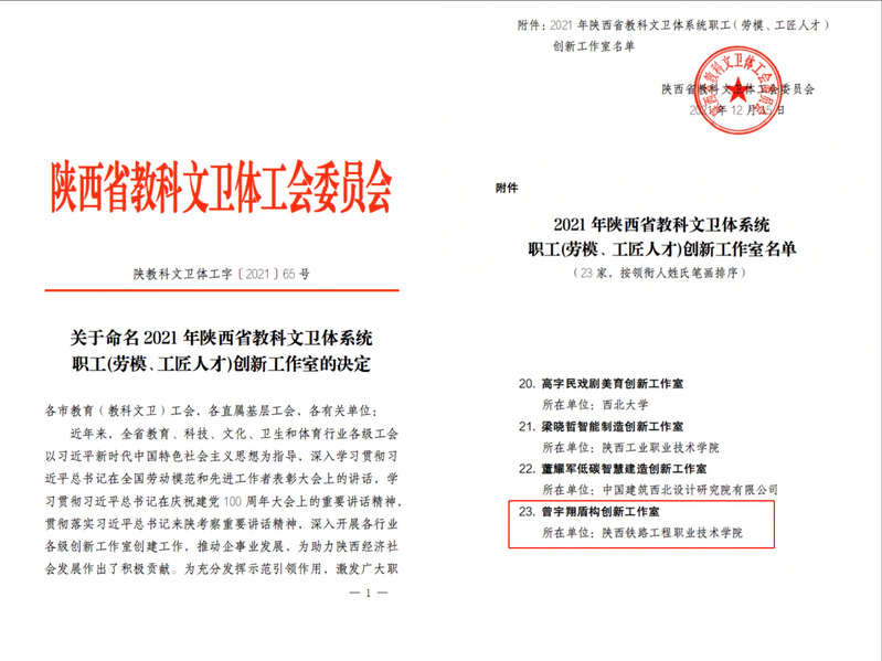 为发挥技能大师在创新实践、技艺传承及工匠精神传承中的示范引领和骨干带头作用,按照《陕西省教科文卫体系统职工(劳模、工匠人才)创新工作室命名管理工作办法(试行)》的相关要求,在校工会指导支持下,公司经公司推荐申报“曾宇翔创新工作室”。经过组建工作室团队,组织撰写工作室申报书,完善工作室软硬件建设,制定工作室管理办法,开展工作室创新活动等举措,最终成功获批省教科文卫体工会职工(劳模)创新工作室命名,并获得3万元建设资金支持。