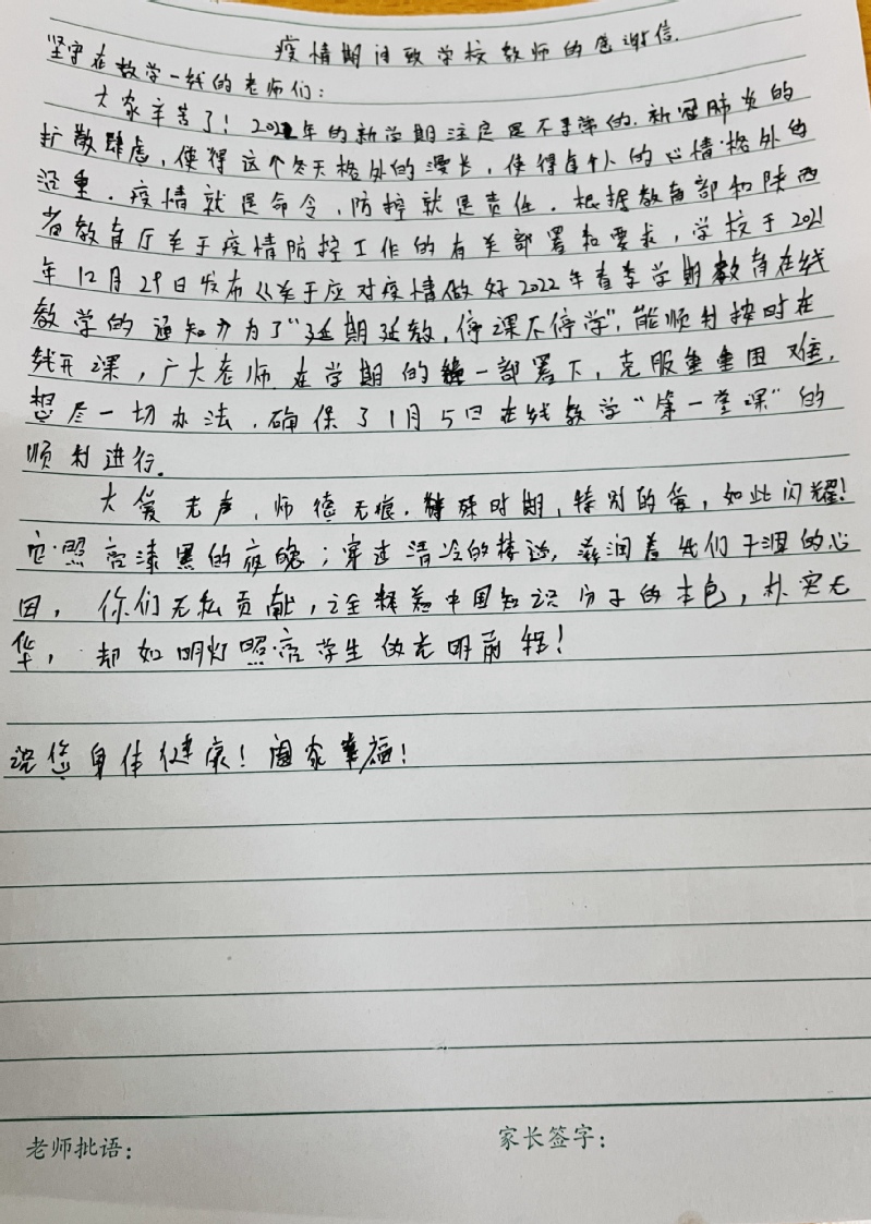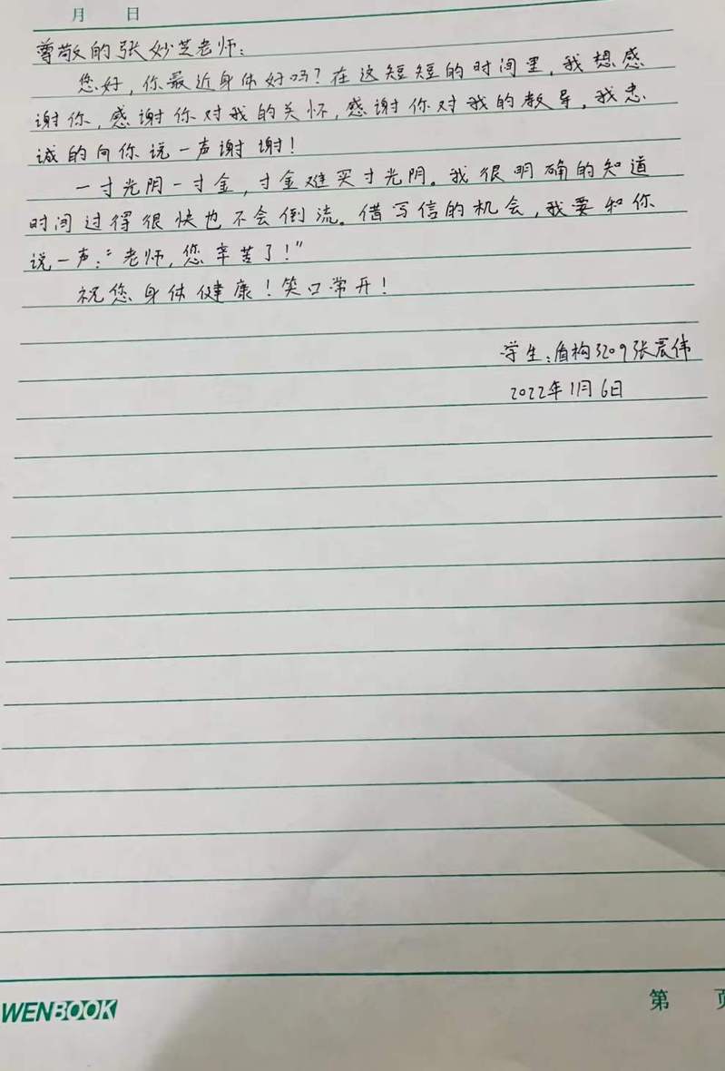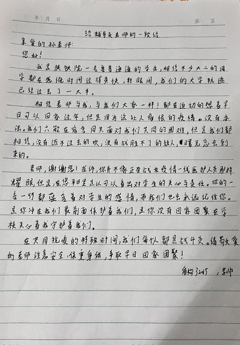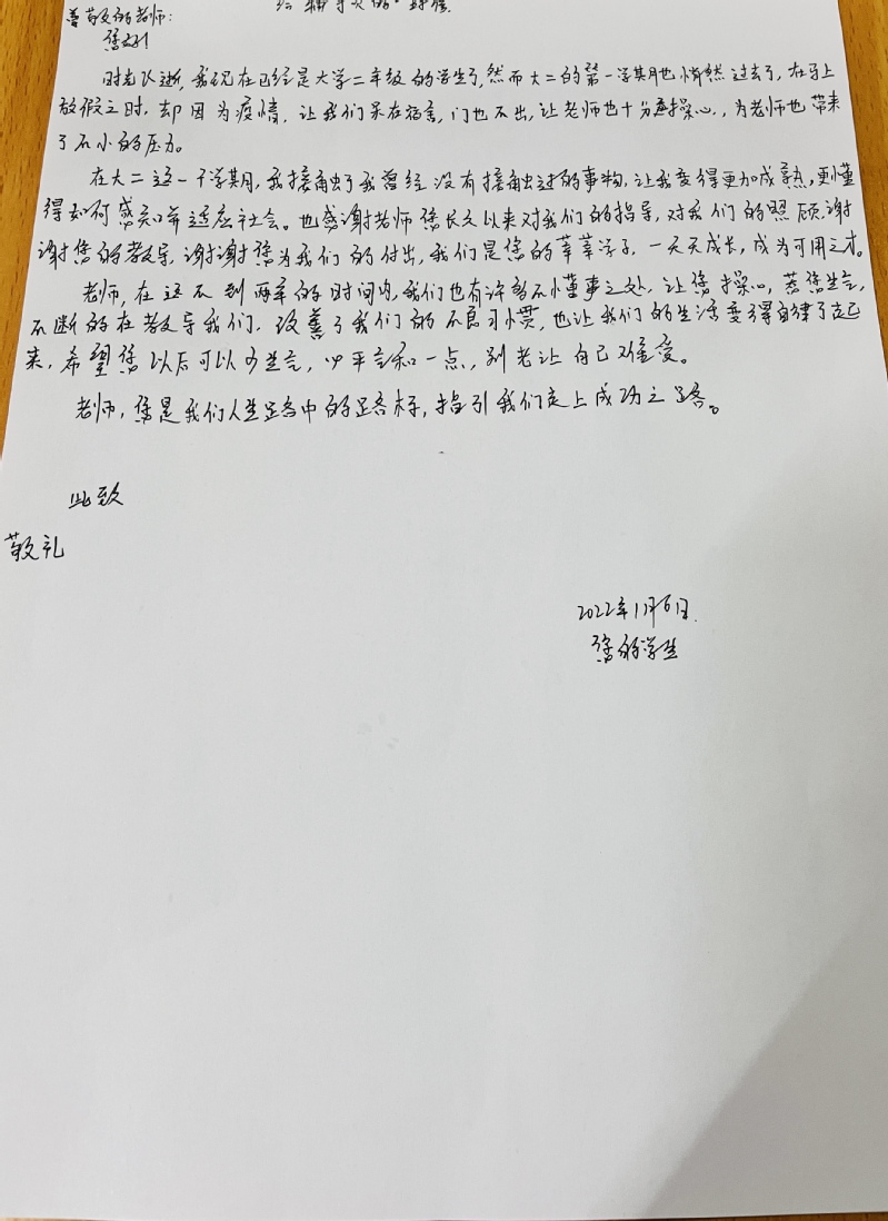 期间,收到员工来信多达300多份,信中主要内容包括感谢师恩(班主任、辅导员、上课老师)、感恩同学室友、公司校园网、思想进步、个人综合素质、感恩专业教师等内容。同学们经过一年的学习成长,懂得了学习专业知识的重要性,尤其对自身职业生涯规划有了更清晰的认识。本次活动通过“写”的表达方式,与同学们面对面的沟通交流,深层次了解疫情防控期间员工们的心理压力,有效做到给同学们“减减压”。同时,公司也积极勉励同学们,心中有大爱,不惧疫情,共同抗疫,共筑抗疫力量。(孙喜文/文)