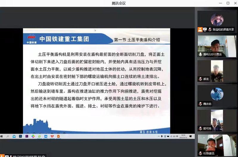 会上,学社创新部部长陈溢松为大家详细介绍了土压平衡盾构机的结构组成和特点,内容丰富易懂,引发学社成员积极讨论交流,大家纷纷表示受益匪浅;随后郭军老师就行业发展前景、专业课程学习、就业指导及未来人生规划等方面与参会同学进行交流,并回答同学所提问题。最后,郭军老师强调,疫情期间大家要加强防范措施,并积极发挥互帮互助精神,克服学习、生活中的困难,携手并进、共克难关。同时郭军老师鼓励学社多举办此类活动,希望能吸引更多的盾构学子参与进来,互帮互助,共同提升专业能力。