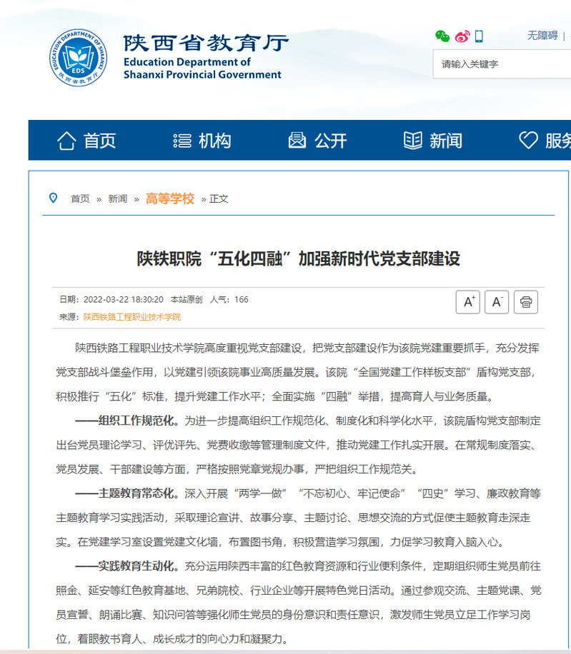近日,陕西省教育厅对城轨公司盾构样板支部积极推行“五化”标准,提升党建工作水平;全面实施“四融”举措,提高育人与业务质量相关做法进行了报道。