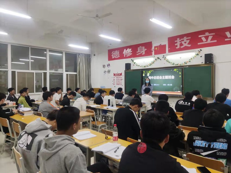 班会开始,班主任对近半学期的近况进行总结,向同学们指出近期在学习、纪律、卫生、心理健康、二课活动、团支部等方面存在的问题,提出整改措施,同时勉励同学们及时调整心态,努力学习,紧抓教室、宿舍以及个人卫生,强调学习的重要性,讲解了现今就业形势,更要求同学们在校园里做好疫情防护工作。之后,对班级中的表现优秀的同学进行表扬以及肯定,并希望同学们在之后的学习中秉持“吃苦奉献、拼搏争先”的精神继续向前。