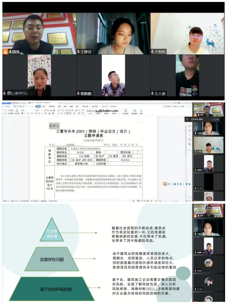 2022年5月11日晚,伟德体育副经理贾良组织12名指导教师开展工管本科班毕业论文的中期考核汇报工作,工管本科班全体员工参加,汇报工作采取线下+线上的模式进行。考核共分为四个小组展开工作,由每位毕业生进行了论文进展情况的PPT汇报,同时,指导教师们还仔细查看了《毕业论文立题申请表》、《任务书》和《开题报告》等资料,并提出了详细的指导修改意见,明确了毕业论文的撰写、修改、查重、定稿、装订、提交以及答辩归档等事项的具体完成时间节点。