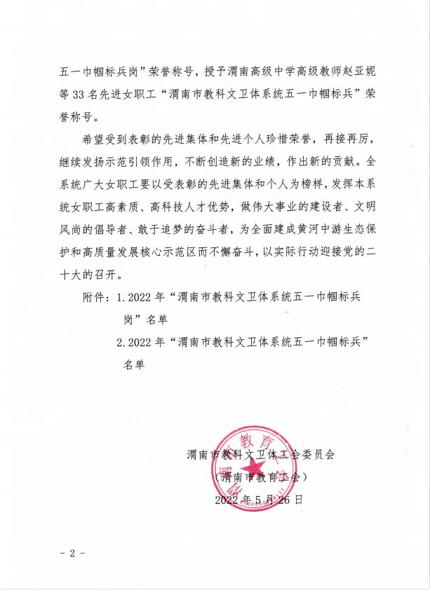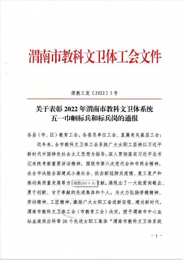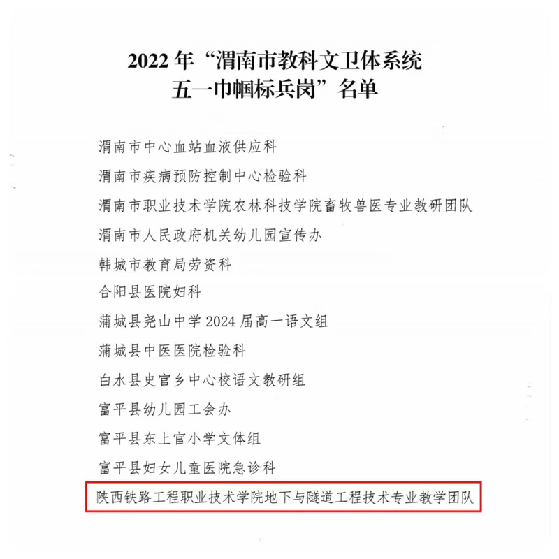 根据《关于表彰2022年渭南市教科文卫体系统五一巾帼标兵和标兵岗的通报》渭教工发〔2022〕3号文件,伟德体育地下与隧道工程技术专业教学团队被渭南市科教文卫体工会(市教育工会)授予“渭南市科教文卫体系统五一巾帼标兵岗”荣誉称号。