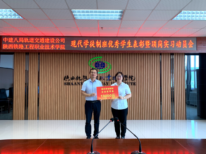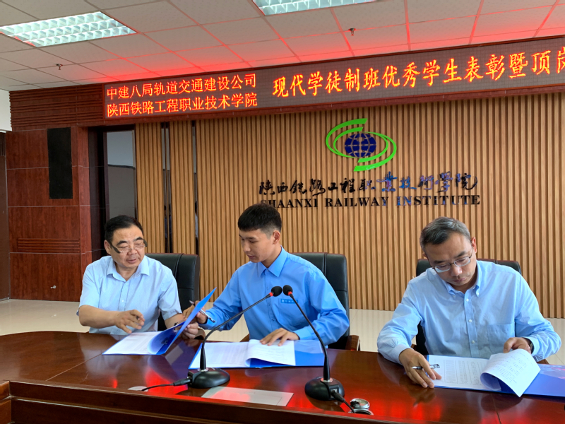 之后,李书记与马总分别代表校企双方签订现代学徒制校企合作协议级三方协议;任文副处长宣读了表彰中建八局轨道公司现代学徒制班优秀员工的决定。企业代表徐倩经理颁发企业奖学金牌匾,公司代表党总支书记任庆国接牌,并合影留念,之后对学徒制班获奖的20名同学分别颁发企业奖学金荣誉证书。