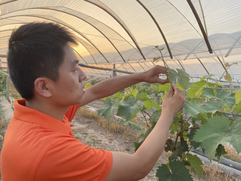 到达种植园,任师傅详细的向实践团队介绍了葡萄栽培的技术要点,在葡萄生长期间要将过多不必要的嫩梢尽早抹除,称之为“抹芽”;当新梢长至5-30厘米时,要及时的绑梢,并将卷须摘除;果穗以上的副梢留2叶摘心,以下的副梢可以从根部除去。之后同学们也纷纷上手进行了实践。