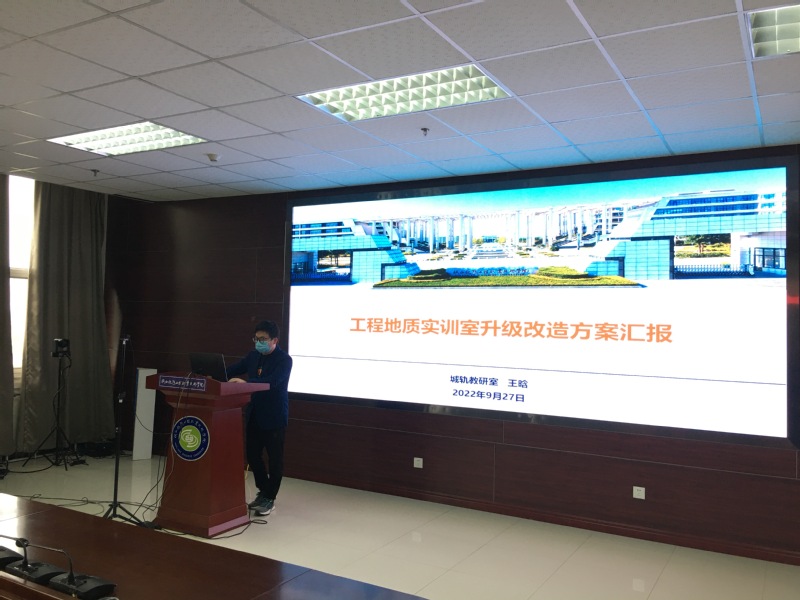 会上,王晗、陈艳茹两位老师分别从建设意义、思路、周期与预算等方面介绍了工程地质实训室升级改造及市政工程施工虚拟仿真实训系统两个项目。