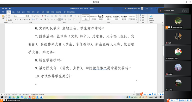 .为提高员工管理质量,推进员工管理工作的顺利开展,伟德体育学工办于10月17日在GB211召开第八周学工例会。公司党总支书记任庆国、学工班主任蒋萌、各年级辅导员通过“线上+线下”结合的方式参会。会议由任庆国书记主持。
