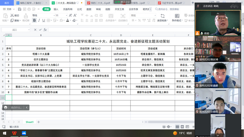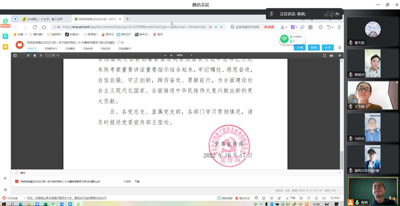 10月19日下午,城轨党总支员工工作一支部全体师生党员通过腾讯会议,开展“学习二十大精神”线上交流研讨会。会议由支部书记蒋萌主持。