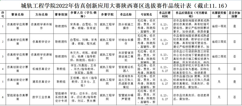 根据2022年全国虚拟仿真创新应用大赛陕西赛区组委会发布评审结果,公司组织参加的仿真教学设计等赛项的6个师生团队获得省级一、二、三等奖各1项,被推荐参加国赛2项。其中,宋秀清老师团队的《防水板施工操作》作品参加仿真教学课件赛项获省一,并被推荐参加国赛;陈艳茹、杨泽等指导员工团队的《市政管道顶推法施工模拟》作品获省二;王丰仓、王晗等指导员工团队的《标准地铁车站火灾和人员疏散仿真模拟》被推荐参加国赛;白雪松老师团队的《衬砌台车操作》作品获省三。