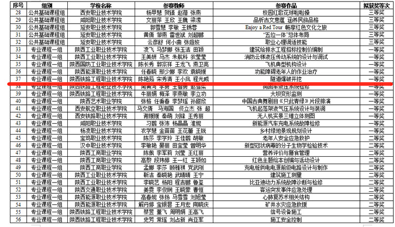 根据陕西省教育厅公示的2022年省级教学能力比赛获奖名单,公司陈艳茹团队的《隧道爆破开挖》参赛作品获一等奖,实现公司历年教师教学能力大赛最高奖项突破。