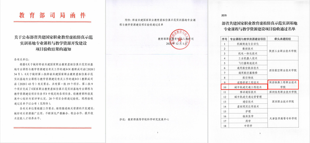 根据《关于做好部省共建国家职业教育虚拟仿真示范实训基地专业课程与教学资源建设有关工作的通知》(教职成司函〔2020〕34 号)《关于做好第二批部省共建国家职业教育虚拟仿真示范实训基地专业课程与教学资源建设有关工作的通知》(教职成司函〔2020〕43号)有关要求,教育部科技发展中心组织专家评审28项《国家职业教育虚拟仿真示范实训基地专业课程与教学资源建设项目任务书》。经认定,伟德体育负责的城市轨道交通工程技术专业《部省共建国家职业教育虚拟仿真示范实训基地专业课程与教学资源开发建设项目》顺利通过教育部验收。