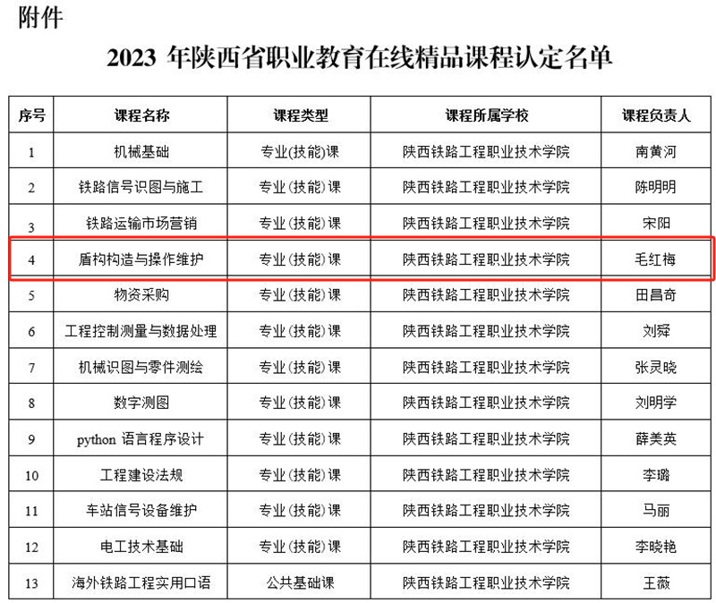 11月27日,陕西省教育厅发布了《陕西省教育厅办公室关于公布2023年陕西省职业教育在线精品课程认定结果的通知》(陕教职办〔2023〕52号)通知,公司毛红梅教授主持《盾构构造与操作维护》课程成功入选。