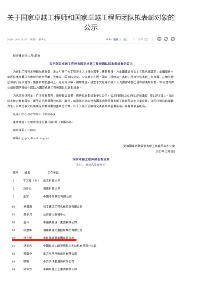 近日,党中央、国务院为表彰工程技术领域先进典型,激发引领广大工程技术人才埋头苦干、勇毅前行,为全面建设社会主义现代化国家、全面推进中华民族伟大复兴作出新的更大贡献,今年首次开展“国家工程师奖”表彰。经综合评审,确定丁文红等83名个人为国家卓越工程师拟表彰对象、5G标准与产业创新团队等50个团队为国家卓越工程师团队拟表彰对象。其中,公司城轨“双高”专业群带头人,中国中铁隧道局集团有限公司总工程师洪开荣位列其中。