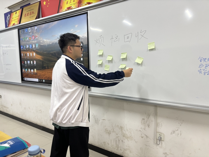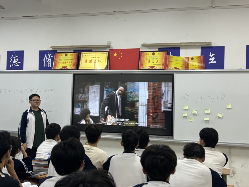 本次心理活动一共三个部分,分别是分享心理故事、烦恼回收板、观看心理教育电影《当幸福来敲门》。活动开始后,同学们积极发言并参与讨论,分享了自己在生活中遇到的各种困惑和应对经验。大家一致认为,保持积极的心态、学会自我调节、寻求支持以及合理运用心理调适技巧是解决此类困惑的关键。烦恼回收板环节,同学们将自己的烦恼和不开心的事写在便利贴上,再贴到白板上,互相倾诉、共同宣泄,以此抒发自己的心情。最后同学们一起观看了心理电影《当幸福来敲门》。