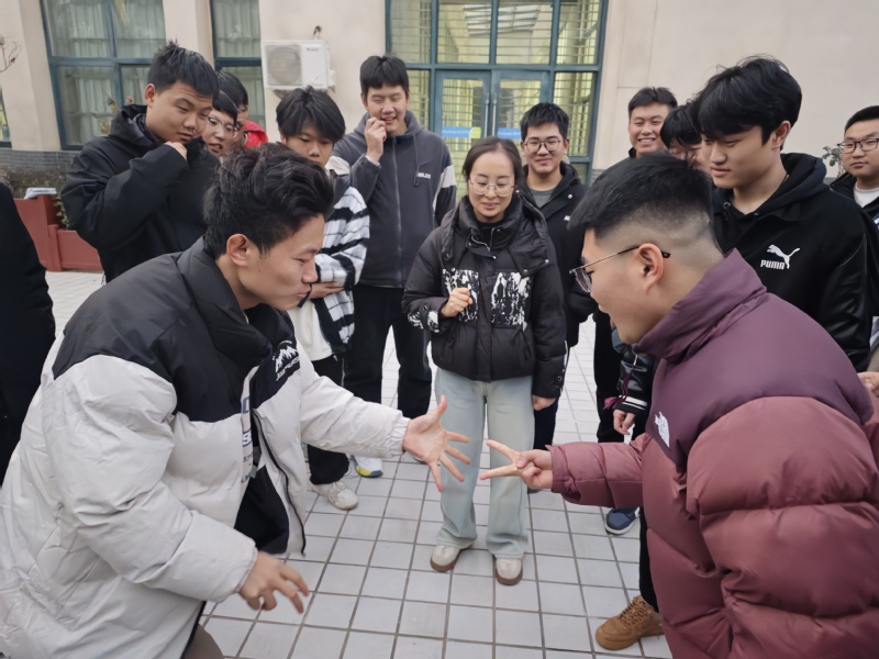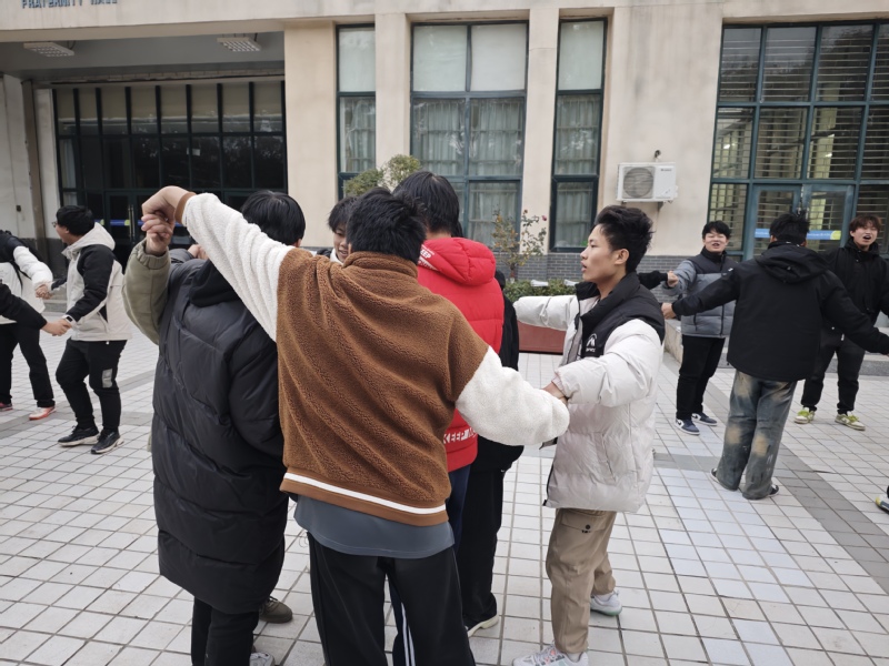 活动现场,辅导员王老师全程引导,以轻松有趣的“破冰游戏”开场,迅速拉近了员工间的距离,打破了陌生感,欢声笑语回荡全场。随后开启“心有千千结”环节,同学们手拉手随意穿梭、交叉,形成复杂的“人结”,在冷静思考、耐心沟通、默契配合下慢慢拆解,过程中大家相互支招,每解开一环都伴随着欢呼雀跃,团队凝聚力悄然提升。 “名字风暴”环节随后再次提高了现场气氛。同学们分成两组,依次大声、清晰说出对面组员工的姓名。高潮环节非“倒着说”莫属,参与者需迅速将听到的词句倒序复述,答错就表演小节目。紧张抢答、偶尔“卡壳”引发阵阵哄笑,思维敏捷者赢得喝彩,失误同学也用才艺逗乐全场,把活动氛围推上顶点。